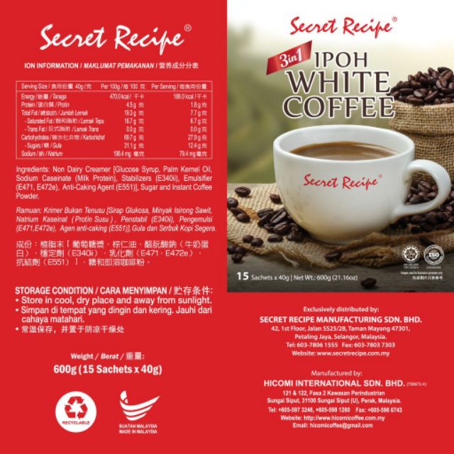Secret recipe ipoh white coffee. Secret Recipe 3in1 IPOH White Coffee - 15 sachets x 40g. Secret Recipe Ipoh White Coffee. Tapi walaupun hanya 15 paket setiap isi kopinya memang padat gile.