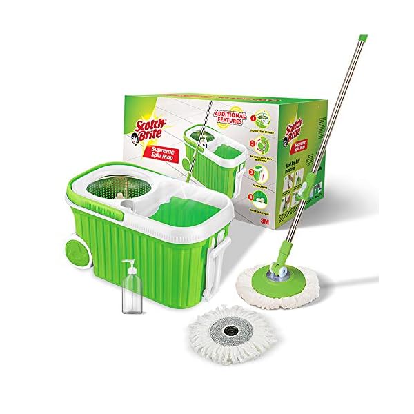 Scotch-Brite Supreme Spin Bucket Mop with Steel Spinner Wheels Drag Handle Drain Plug Dispenser 2N Microfiber Refills IS840126848 42 out of 5 stars 1428 154900 1549. Twin Bucket Spin Mop for easy wringing and rinsing Microfibre technology helps lift and trap dirt with unique easy-clean surface for superior clean Dual refill ensures usage depending on cleaning occasion and frequency and ensures that it lasts longer 360-degree telescopic handle to reach nooks and corners easily Material. The twin bucket mechanism helps you wash and wring the mop head easily.