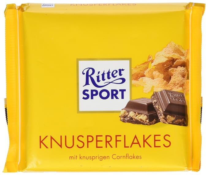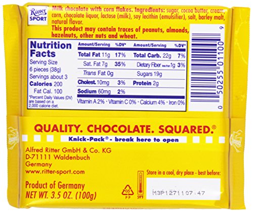 Ritter Sport Cornflakes are all-day breakfast around the clock with crispy cornflakes in creamy chocolate. 300g Nutrition Facts - Similar. Ritter Sport-German Edition post from 2017 featuring German flavors I couldnt track down in the US.