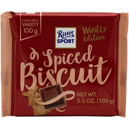 Firstly an extra large square biscuit of biscuits secondly wrapped in the finest chocolate. Ritter Sport Spiced Biscuits Winter Edition 100g A deliciously warm spiced biscuit covered in fine chocolate. Limited to the Christmas Period these are certainly a must have for the festive season.